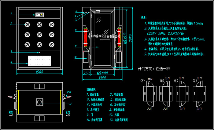 气流设计:风淋室应采用垂直或水平气流设计,确保气流覆盖整个吹淋区域。